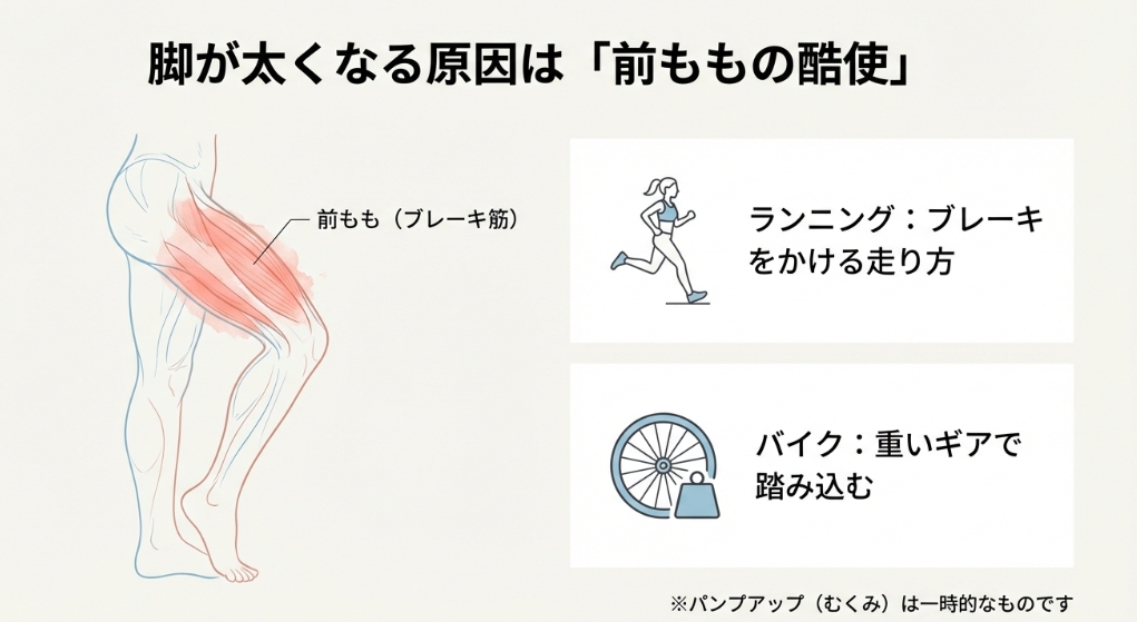 ブレーキをかけるような走り方や、ペダルを重くして踏み込む動作は、太ももの前側の筋肉を肥大させます。ここは鍛えると外側に張り出しやすいため、脚が太く見えてしまうのです。 - 一時的な「パンプアップ」と「むくみ」